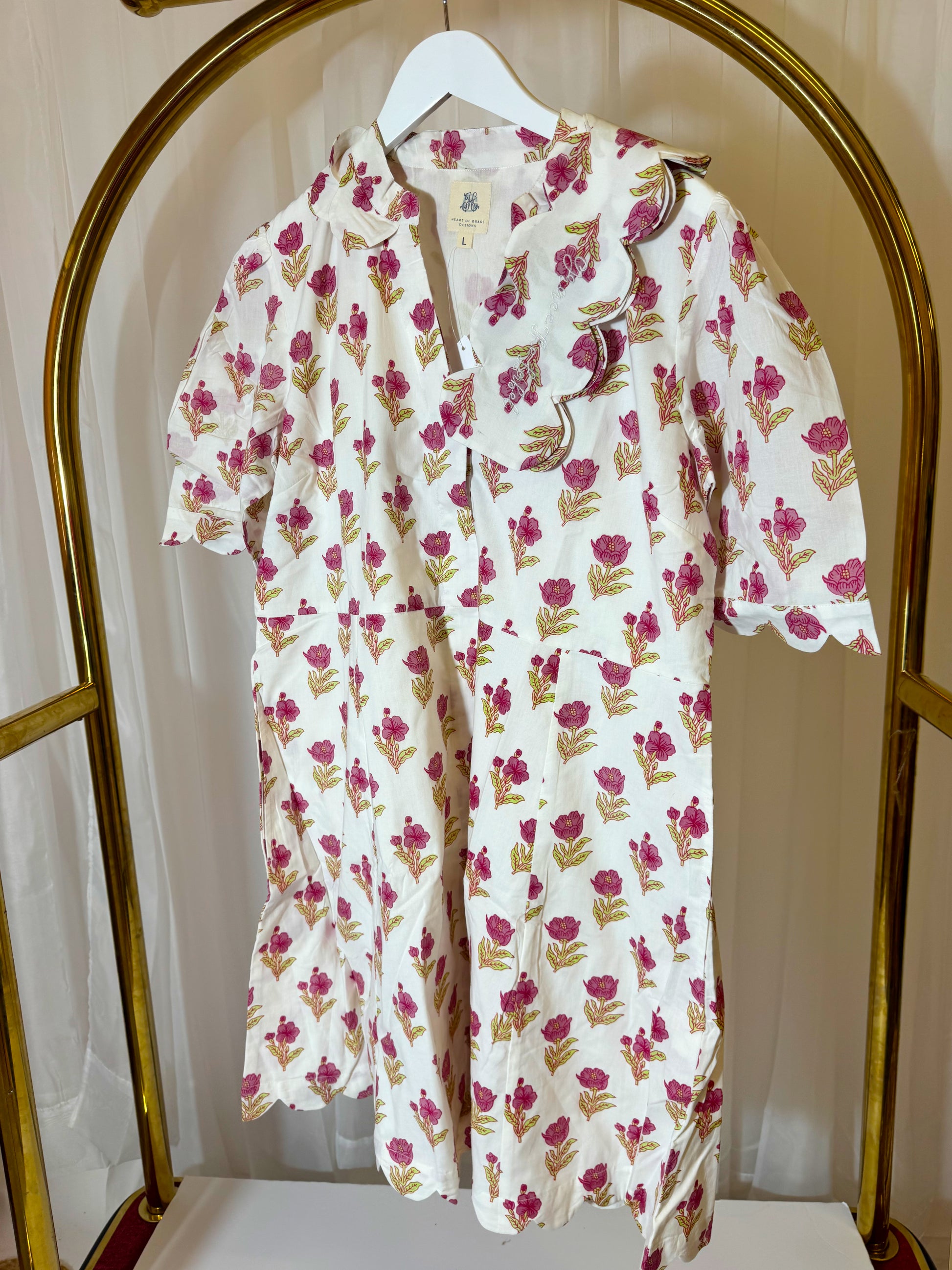 Step into timeless charm with our Magnolia Grace Maxi Dress. Crafted from 100% cotton and double-lined for a soft, comfortable feel, this dress features a delicate blue dot pattern complemented by scalloped detailing along the collar, waist tie, and hem, adding a touch of refined elegance. The adjustable waist tie creates a flattering silhouette, while the flowing design drapes beautifully for a graceful, feminine look.